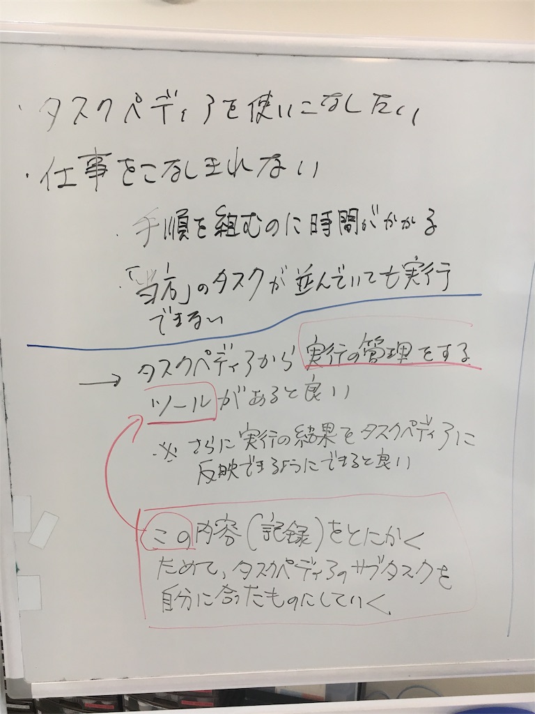 そこでは、タスク管理の基本をご説明して、個別の事例検討(お悩み相談)をみんなで考え、まずはどうすれば良いか(ネクストアクション)を考えました。